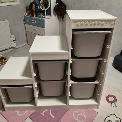 Tarjolla olisi 4 kpl Ikean Trofast runkoja (mänty). Kahteen runkoon mukaan laatikot: 1 iso, 3 keskikokoista, 3 pientä, neljä kantta. Kahteen runkoon mukaan hyllylevyt yhteensä 4kpl.