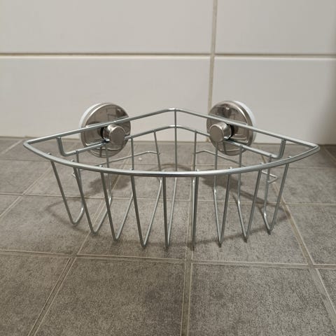 Musta metallinen suihkuteline, jossa on imukuppikiinnitys. Täysin ehjä ja vain vähän käytetty. Vain nouto.