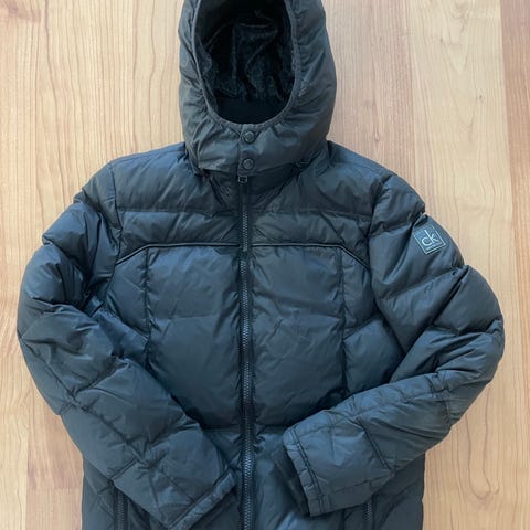 Calvin Klein talvitakki mustassa värissä, koko L. Untuvatakki. Rinnanmerkistä osa kulunut ja vetoketjussa kulumaa. Näistä kuva. Huomioitu hinnassa.