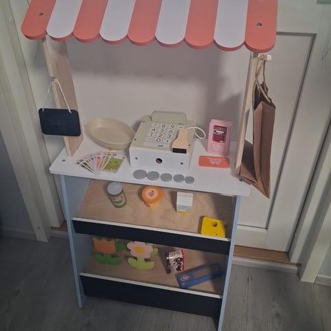 Oikein hyväkuntoinen puinen leikkikauppa. Etuosassa liitutaulu ja lisäksi erillinen pieni roikkuva liitutaulu. 2 -osainen, kaupan voi asetella monin eri tavoin. Mukaan tulee puinen ostoskori, omena ja brezl sekä synttärikakku (jossa tummentumaa) ja pehmoinen vihanneskori. Pienet posliiniastiat saa myös halutessaan mukaan. Kuljetus on mahdollinen lähialueelle. Eläintalous.