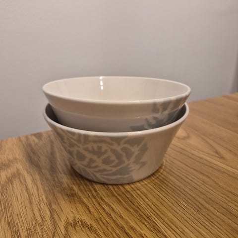 Pentikin hyväkuntoiset vaaleanpunareunuksiset kulhot, 2 kpl. Kulhon halkaisija n. 11,5 cm ja korkeus n. 5 cm.
