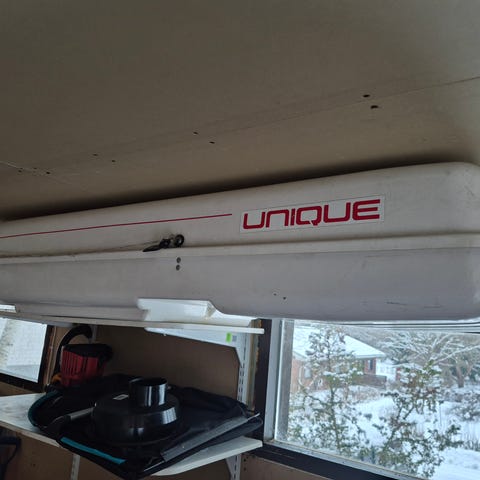 Kuvan mukainen kapea suksiboksi. Avaimet ja kiinnikkeet löytyy