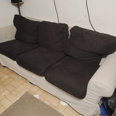 Tyynyt tulevat mukaan. Istuintyynyt saa kiinnitettyä sohvaan vetoketjuin. Aiemmassa kodissa ollut eläimiä. Vähän nukkaa, ei haittaa käyttöä.