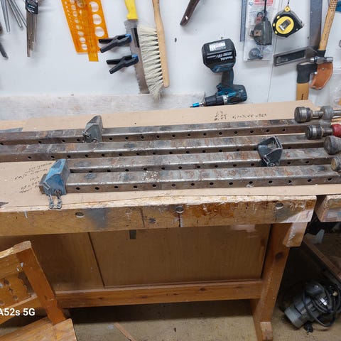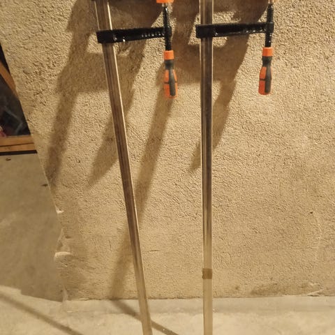 Hyväkuntoiset puristimet liimalevyn valmistukseen. Pidempien pituus 1200mm ja lyhyt 600mm.