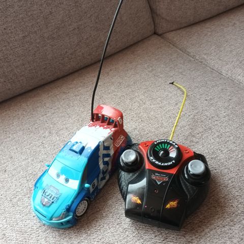 Paristot sisältyvät pakettiin. Paristokotelon kannen kiinnikkeen toinen siiveke puuttuu, mutta on pysynyt kiinni yhdelläkin. Auton pinnassa edellisen leikkijän jäljiltä jotain tarraliimajäämiä.