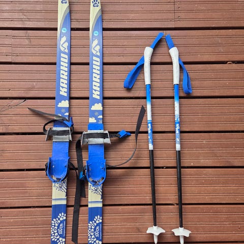 Myydään pikkulasten ensisuksipaketti. Sukset 90 cm, sauvat 70 cm. Suksissa on pitävä kuvioitu pohja ja sukset laitetaan remmeillä kiinni omiin kenkiin.