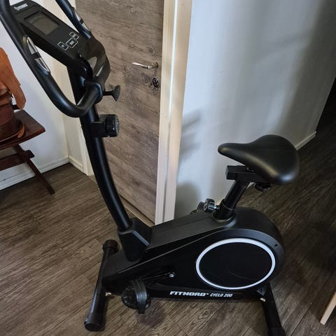 Kuntopyörä musta ja harmaa väri, varustettu polkimilla ja satulalla. Sopii kotikäyttöön kuntoiluun ja pyöräilyharjoitteluun.