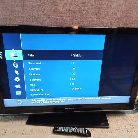 Samsung LE40A656A1WXXE LCD-televisio, 40 tuumaa, musta väri. Televisiossa on useita liitäntämahdollisuuksia, mukaan lukien HDMI, SCART ja komponenttivideoliitännät. Mukana kaukosäädin ja käyttöohje.