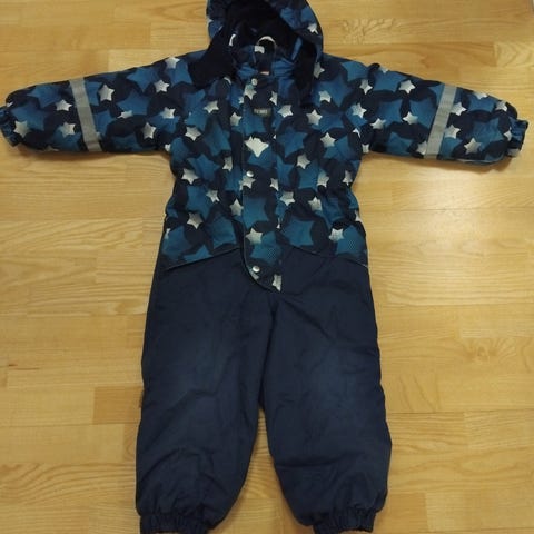 Siisti talvihaalari seuraavalle käyttöön. Koko 110cm. Viimeisessä kuvassa näkyy parhaiten väri sellaisena kun on kunnon valossa. Jalkarenksut puuttuvat, muuten ei mielestäni puutteita. Polvissa ja pepun kohdalla aavistus kulumaa.