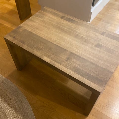 Laatikollinen sohvapöytä (mäntyä) jalat kuultomaalattu valkoiseksi. Mitat: pituus 105, leveys 70, korkeus 48. Hyväkuntoinen, pöydän pinnalla pieniä naarmuja (kuva).