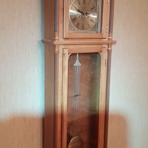 Rhythm merkkinen kello.toimii patterilla.korkeus 90cm leveys 34cm.soittoääni jonka saa myös pois päältä.