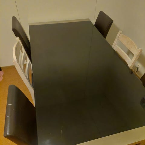 Pöytä on todella jykevä, tuoleista osa parempia osa huonompia. Tuoleja on osittain liimailtu uudelleen löysymisen vuoksi.