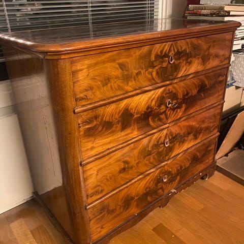 Antiikkinen puinen lipasto, mahalipasto tai senkki, jossa on punamarmorikansi. Lipastossa on kaksi vetolaatikkoa, jonka ylimmäisessä laatikossa on sisällä pienemmät laatikot ja vihreä pohjakangas. Senkissä on koristeelliset metallivetimet ja kaarevat jalat. Korkea ja leveä muotoilu, joka sopii säilytykseen ja sisustukseen.