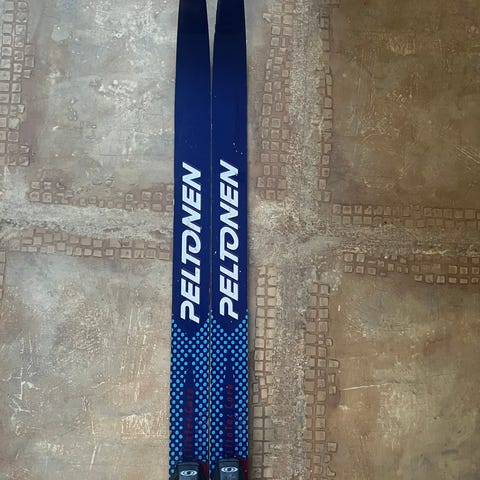 Peltonen hiihtosukset, pituus 140 cm, värit punainen ja musta. Rottefella NNN siteet. Ei enää parhaassa kunnossa, mutta ainakin pakolliset kouluhiihdot menee ;)