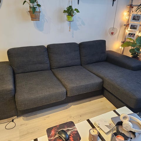 Harmaa kangassohva, jossa on irrotettavat selkätyynyt ja pehmeä istuinosa. Sohva soveltuu makuuhuoneeseen tai olohuoneeseen lisävuoteeksi tai oleskeluun. Kolmen istuttava. Nouto Kokkola.