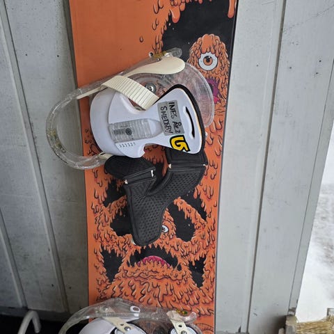 Burton Chopper lumilauta, pituus 100 cm + Burton Grom siteet ja kengät. Kengät kokoa 31,5. Mukana myös Riglet Reel vetonaru. Kunto 6/5.