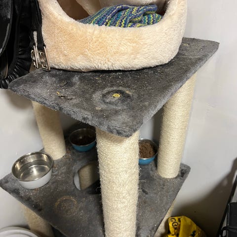Harmaa kissan raapimispuu useilla tasoilla ja pesäkololla. Sisältää raapimapylväitä, pehmustettuja tasoja ja roikkuvan köyden. Käytössä näkyvää kulumaa ja kuluneita kohtia, muuten hyvässä kunnossa.