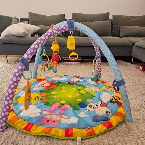 Kaikinpuolin toimiva leikkimatto vauvalle. Äänet ja valot toimii. Yksi kaari tulee kankaasta läpi, saa varmasti ommeltua niin että pysyy taas.