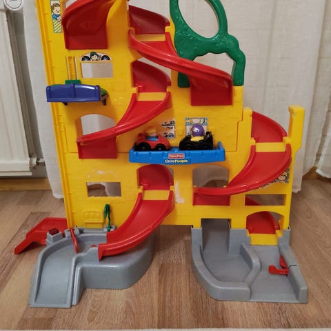 Fisher-Price lasten leikkiauto rata, muovinen, monivärinen. Sisältää useita tasoja ja ramppiosia, sekä pienet leikkiautot. Soveltuu lasten leikkiin ja motoristen taitojen harjoittamiseen.