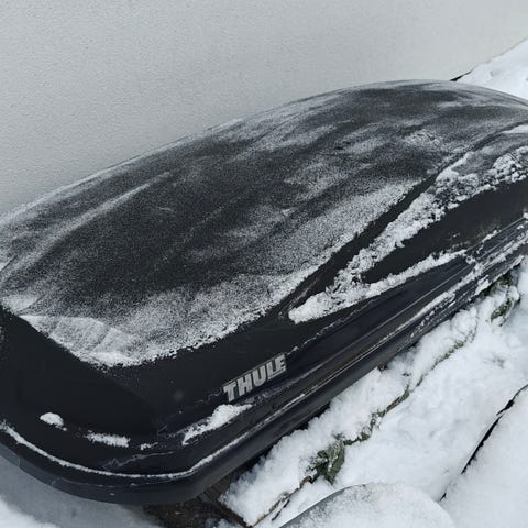 Uutta vastaava musta Thule Atlantis 900 suksiboxi + kattotelineet.