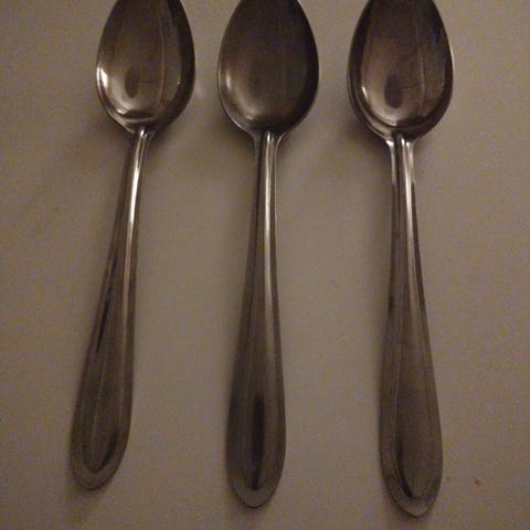 Hackman Scandia -sarjan lusikoita. Sarjan on suunnitellut Kaj Franck Hackman Sorsakoskelle. Vanhempaa tuotantoa.