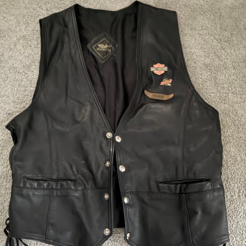 Nahkainen liivi mustassa värissä, koko 62. Valmistettu aidosta lampaannahasta. Liivin edessä on vetoketjulliset taskut. Lisäksi on sivu- ja povitaskut. Etupuolen kiinnitys ; pitkä vetoketju neppareilla.. Liivin yläosassa säädettävä kiristysnauha. Helmassa ; sisälle ommeltu leveä kiristys/ rypytetty kuminauha. Vahvistetut kainalot.