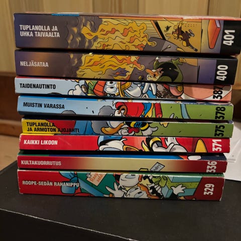 27 kpl Aku Ankan taskukirjoja, hyväkuntoisia. Numeroita väliltä 209 ja 279, kuvassa näkyy mitkä numerot. Vain nouto.