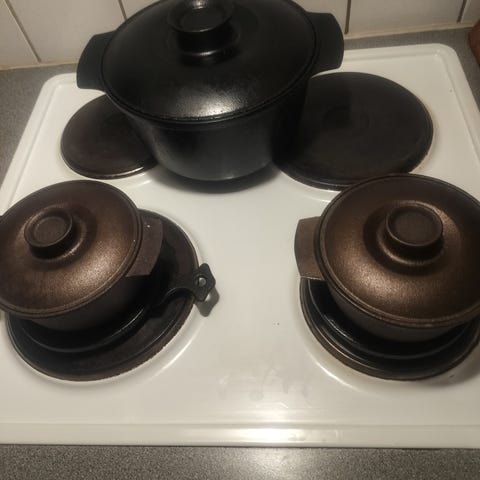 Myydään kolme kotimaista vanhaa valurautapannua. Kaikki hyvässä kunnossa ja rasvapoltettu. Lettupannu valmistaja Wärtsilä ja halkaisija 21 cm. Rosenlewin paistinpannu 23 cm ja siinä kummallakin puolella kaatonokat. Porin valun valmistama paistinpannu myös 23 cm. Hinta 20€kpl tai kaikki 50€.