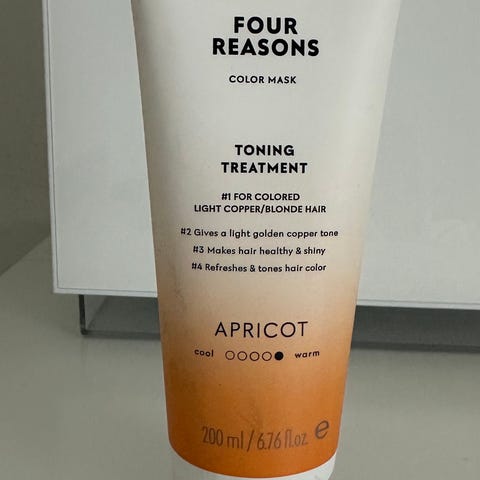 Four Reasons Color Mask Toning Treatment tehohoitoaine. Suunniteltu erityisesti värjätyille kuparinpunaisille hiuksille. Tuote antaa intensiivisen kuparin sävyn, tekee hiuksista terveet ja kiiltävät sekä virkistää ja ylläpitää hiusväriä. Sopii käytettäväksi värjätyille hiuksille sävyn ylläpitämiseen ja hoitamiseen. Molemmista käytetty ehkä 3kertaa, yli puolet vähintään jäljellä. Hiusten väri muuttui eikä enää tarvetta. Erinomainen tuote. Yhteishinta.