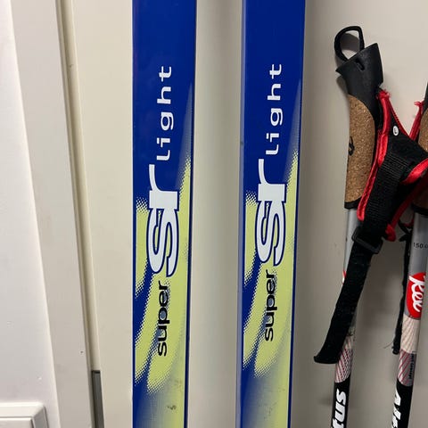 Karhu 170 cm maastohiihtosukset, joissa on sinivalkoinen ja keltainen väritys. Sukset on varustettu siteillä ja 135cm sauvoilla, jotka sopivat maastohiihtoon. Karhu-monot koko 40.