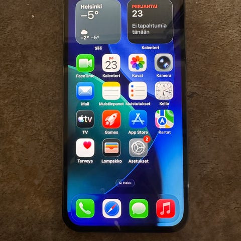 Hyväkuntoinen iPhone 12 Pro Max isolla muistilla. Akun kunto 77%, mutta toimii normaali käytöllä päivän verran. Näytössä nanokalvo, jossa hiusnaarmuja. Itse näyttö virheetön. Vain pelkkä puhelin.