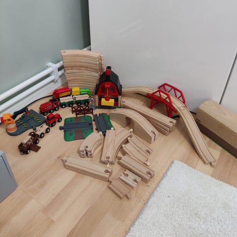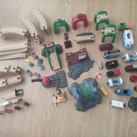 Puinen junarata, joka sisältää useita kaarevia ja suoria kiskoja sekä risteyksiä ja siltoja. Mukana on myös erilaisia puisia junavaunuja, autoja ja muita lisäosia mm 6 siltaa. Mukana myös vanha Brion junarata paketteineen. Huom! Kaikki ei ole Brion vaan mukana myös yhteensopivaa Ikean sarjaa. Sähköinen juna toimii, mutta sen kaukosäädin ei tällä hetkellä (on jäänyt paristot sisään). Juna itsessään toimii omista nappuloistaan moitteetta.