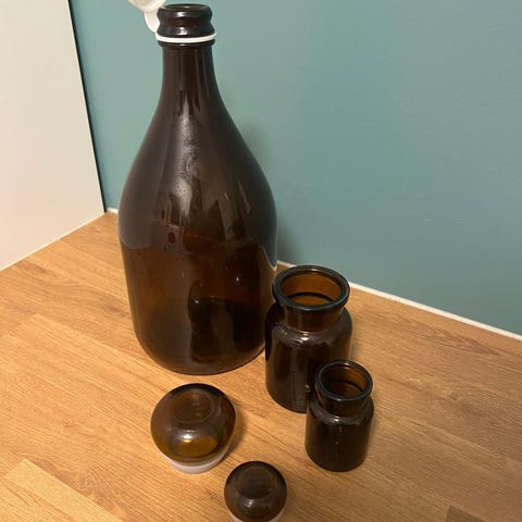 Siisti ja ehjä lasipullo 1 l. Toisella puolella näkyy kirppiksen tarra (myös siellä myynnissä).