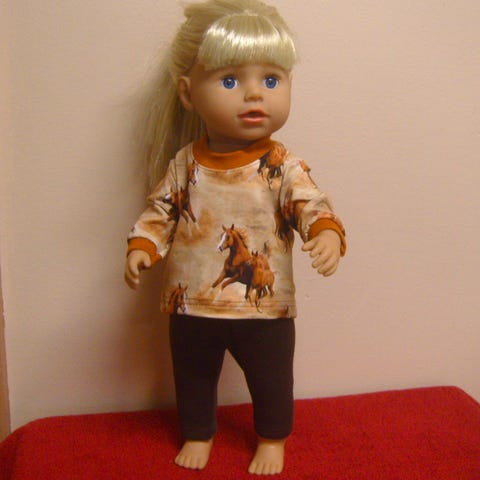 43 cm nukelle (baby born tai sister) trikoosta kuviollinen paita, jossa takana pukemista helpottava tarrakiinnitys. Housuissa vyötäröllä kuminauha.