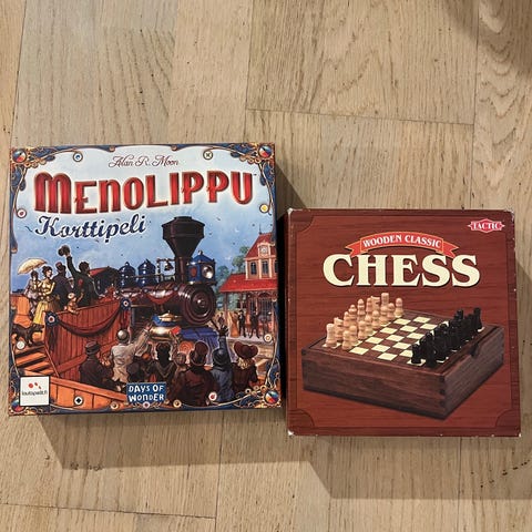 Puinen shakkilauta jossa nappulat menevät laudan sisään, yksi musta nappula hukassa ja korvattu lelulla.
