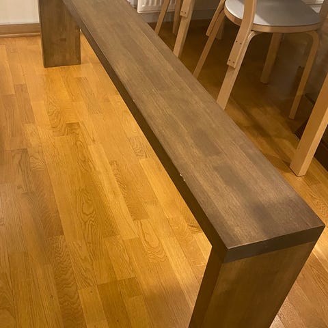 Puusepän mittatilaustyönä valmistama täyspuinen penkki/taso. Ruskeaksi käsiteltyä massiivikoivua. Tukeva ja painava. On valmistettu alunperin 160 cm leveän sängyn jalkopäähän laitettavaksi penkiksi. Sängyn vaihtamisen myötä jäänyt tarpeettomaksi.