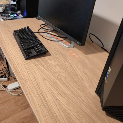 Pöytälevy on taas "kohtalainen", siinä on jonkin verran pienehköjä käytönjälkiä, ja yksi isompi jälki joka näkyy kuvissa. Lisäksi reunan saumanauhan liima on hieman löystynyt sauman kohdasta, joka asettuu pöytälevyn takaosaan, ei siis näy käytössä. Tästä on kuva, sauman saa varmasti pikaliimalla taas kiinni :)