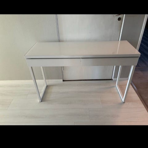 Valkoinen pöytä, kohtalainen kunto. Toinen laatikko vaatii korjausta, pinta kärsinyt. Merkki ehkä Jysk? Nouto Vuosaari, Ramsinranta.