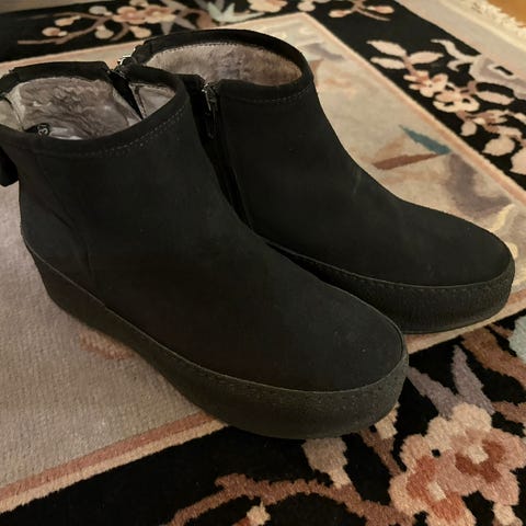 Nude of Scandinavia mustat nahkanilkkurit, joissa on sisällä lämmin karva. Korotettu ja rouhea pohja. Ulkosivulla koristevetoketjut ja sisäsivulla varsinaiset vetovetjut. Koko 37.