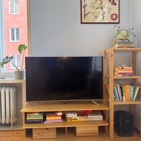 Puinen TV-taso. Alhaalta puuttuu lasihylly, muuten hyvä kunto