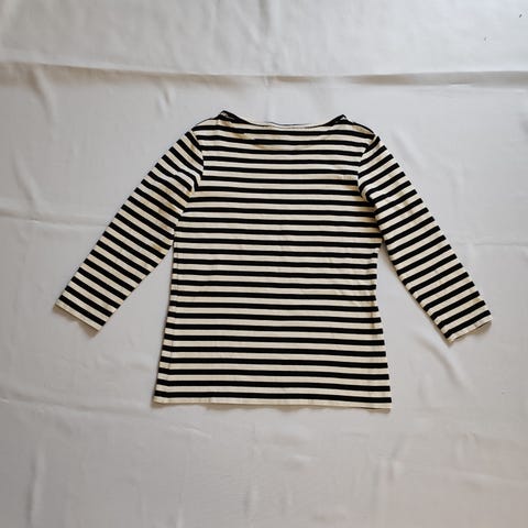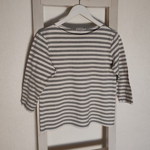 Marimekko paita, koko S, kai-kai 47, pituus 67. Raidallisia, valkoisia ja sinisiä raitoja. Etuosan alareunassa on kaksi huomaamatonta pistettä valkoisella raidalla (kuvassa)