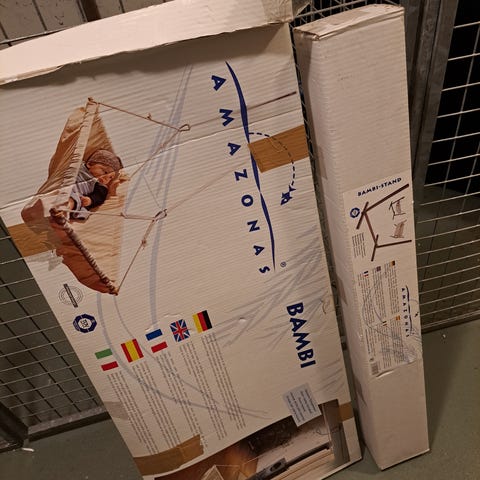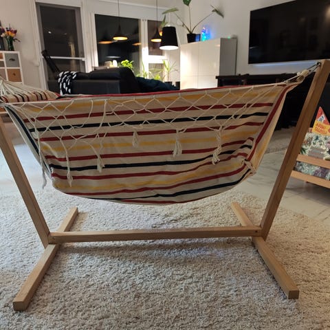 Puinen hieman harvinaisemman näköinen riippukehto, jossa valkoinen kangasosa. Valmistaja/brändi Amazonas. Runkoonhan voisi laittaa myös jonkun muun näköisen kehdon tai vastaavan.