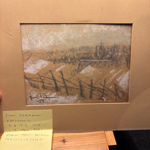 Sign. teos. Metsämaisema, auringonlasku. Maalaus on oranssin ja tummanvihreän sävyinen. Pastelli/liitu paperille. Koko 18 x 27,5 cm. Pieni repeämä teoksessa.