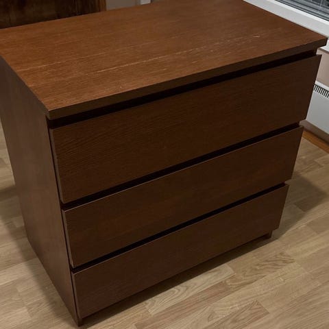 Hyväkuntoinen IKEA:n Malm lipasto kolmella vetolaatikolla.