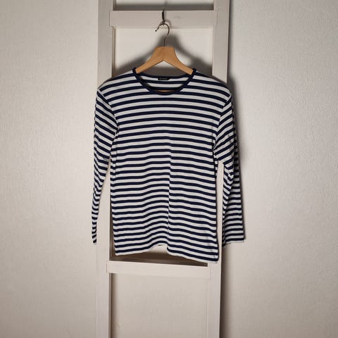 Marimekko paita, koko S, kai-kai 45cm. Pituus 59cm. Raidallinen. Musta ja beige. Ylin lappu Marimekko puuttuu, mutta on sisäinen lappu, jossa on nimi ja hoitotiedot.