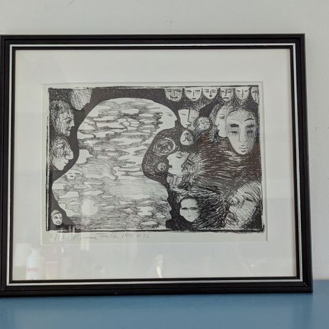 Manno Kalliomäen sign grafiikka 49/50, omakuva vuodelta 1982. Manno Kalliomäki (1949-2005) oli turkulainen taidegraafikko. Hän kuului turkulaiseen Arteen, Suomen Taidegraafikoihin ja Valokuvataiteilijoiden liittoon. Erittäin hyväkuntoinen, koko kehystettynä 58 x 50 cm.