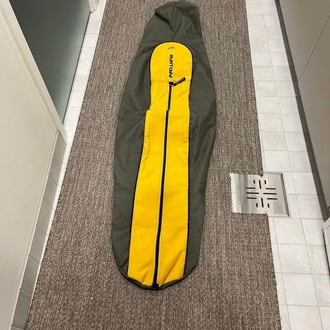 Käytetty kantopussi, jossa pehmustetta. Avataan päädystä. Molemmat vetoketjut ehjät, samoin pussi. Mustalla tussilla peitetty nimi harmaasta osasta. Toimii myös suksille.