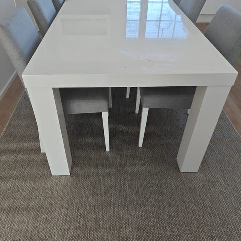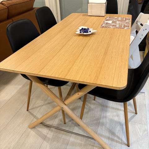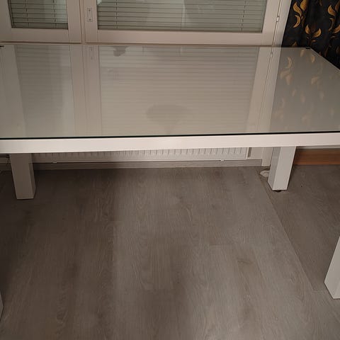 Tukeva ruokapöytä, pöydän pinnassa on jälkiä, jotka näkyvät keskimmäisessä kuvassa. Nouto Riihimäeltä.