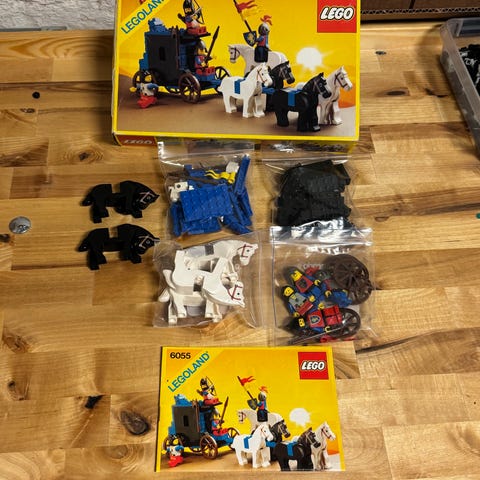 Lego Castle 6055 setti vuodelta 1985. Hevosen satula puuttuu. Muutoin kaikki osat tallessa. Rosvon päähineen kaulaosa katki. Ukkojen kyljet ehjät.
