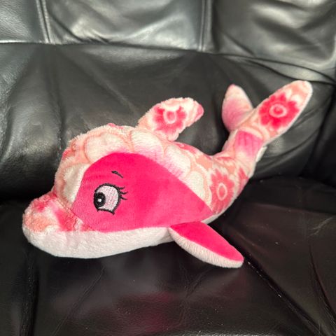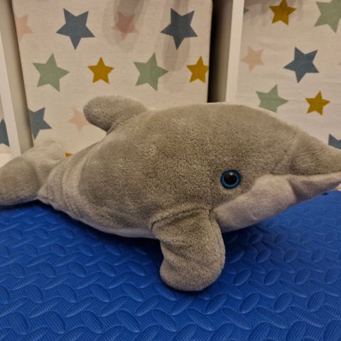 Iso delfiini pehmo, ollut vain sängynpäällä koristeena. Voitettu Särkäniemestä viime kesänä.